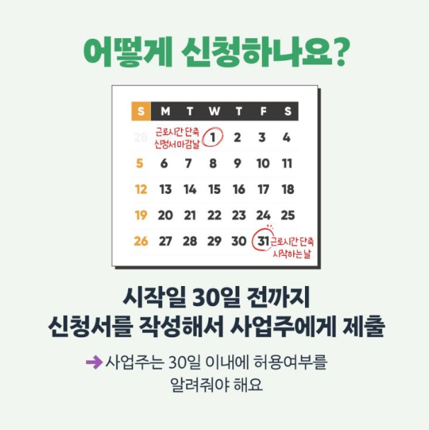 - 근로자: 단축 시작일 30일 전까지 신청서 작성해 사업주에게 제출