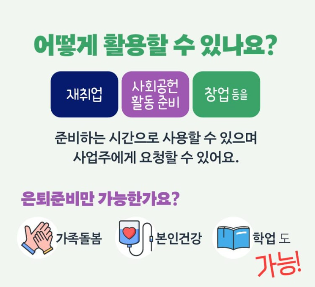 📌 근로자는 회사를 다니며 여유롭게 재취업·창업·사회공헌·가족돌봄·학업 등을 준비할 수 있어요!